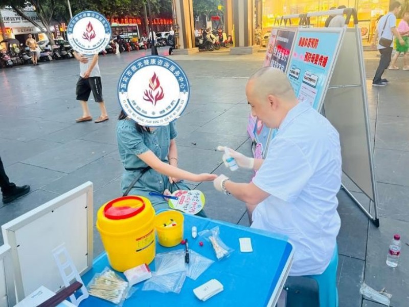 为提升育龄妇女对“艾梅乙”(艾滋病、梅毒和乙肝)的防范意识,普及相关防治知识,2025年7月30日,在宜宾市翠屏区妇幼保健院的支持下,宜宾微光联合宜宾市翠屏区大观楼社区卫生服务中心、宜宾市翠屏区大观楼街道冠英社区居民委员会,在冠英古街举办了一场专门面向育龄妇女的“艾梅乙”宣传干预及检测活动。 活动现场,宜宾微光的志愿者们以面对面的亲切交流,向育龄妇女深入浅出地解析艾滋病的传播途径。在血液传播途径上,着重警示了在不正规场所就医等危险行为背后潜藏的严峻风险;谈及性传播时,特别强调了正确使用安全套的重要性,并详细介绍了高危性行为后的阻断方法。同时,志愿者们还精心分享了一系列实用的预防策略,诸如倡导坚持单一性伴侣、指导熟练掌握安全套的正确使用方法等,旨在帮助育龄妇女逐步建立起对这些疾病的科学认知。