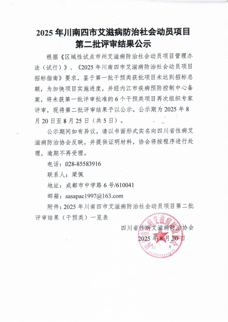 2025 年川南四市艾滋病防治社会动员项目第二批评审结果公示