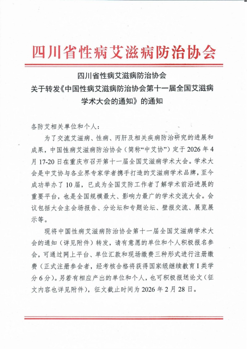 四川省性病艾滋病防治协会关于转发《中国性病艾滋病防治协会第十一届全国艾滋病学术大会的通知》的通知