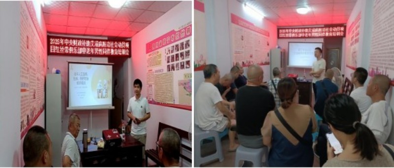 2025年9月11日,遂宁市红丝带俱乐部在遂宁市红丝带俱乐部内召开了2025年中央财政补助艾滋病防治社会动员项目《遂宁市红丝带俱乐部中老年男性干预项目》同伴教育员培训会活动。 遂宁市红丝带俱乐部邀请了遂宁市CDC艾防科科长祝皓、遂宁市船山区CDC艾防科科员曾海辉对10名高危中老年男性同伴教育员进行了艾滋病预防知识、“四免、一关怀”政策、艾滋病危害性认识、艾滋病检测与治疗、艾滋病的法律、法规以及同伴教育员在执行项目活动中的职责。